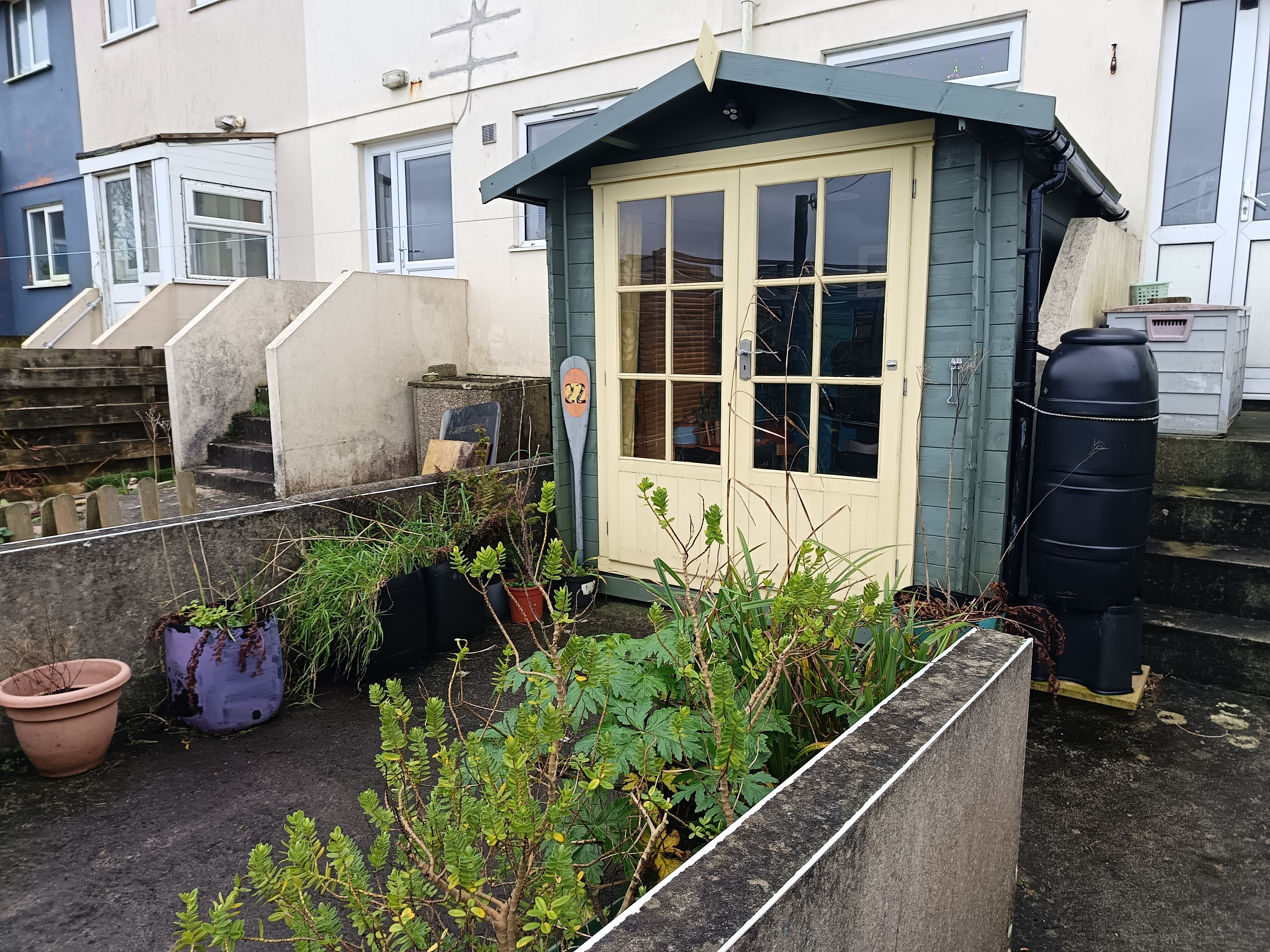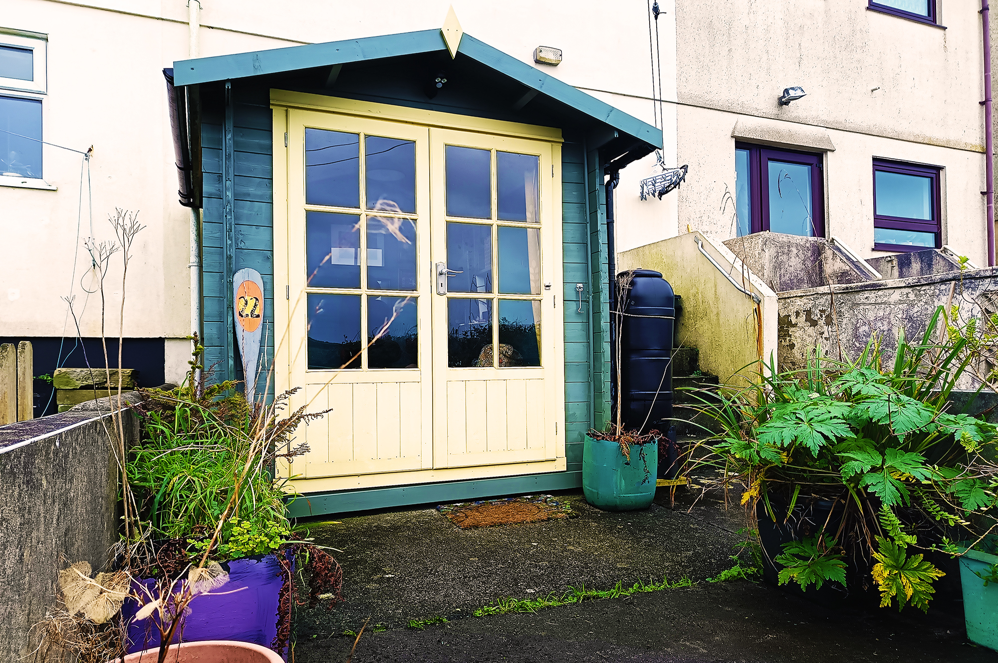 When you arrive, rather than coming to the front of the house, you’ll see an alley down the side of our neighbour’s house (no. 21 – the neighbour to our left if facing ours). Follow that alley to the end and turn right down the back alley and you’ll see the office.