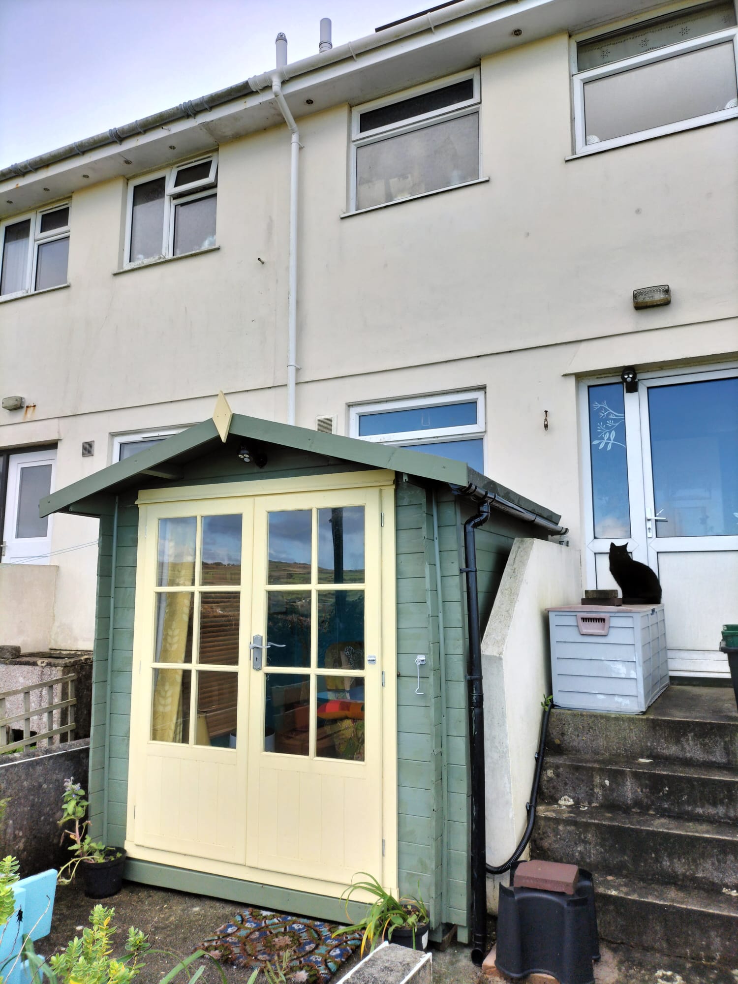 Then when you arrive, rather than coming to the front of the house, you’ll see an alley down the side of our neighbour’s house (no. 21 – the neighbour to our left if facing ours). Follow that alley to the end and turn right down the back alley and you’ll see the office.